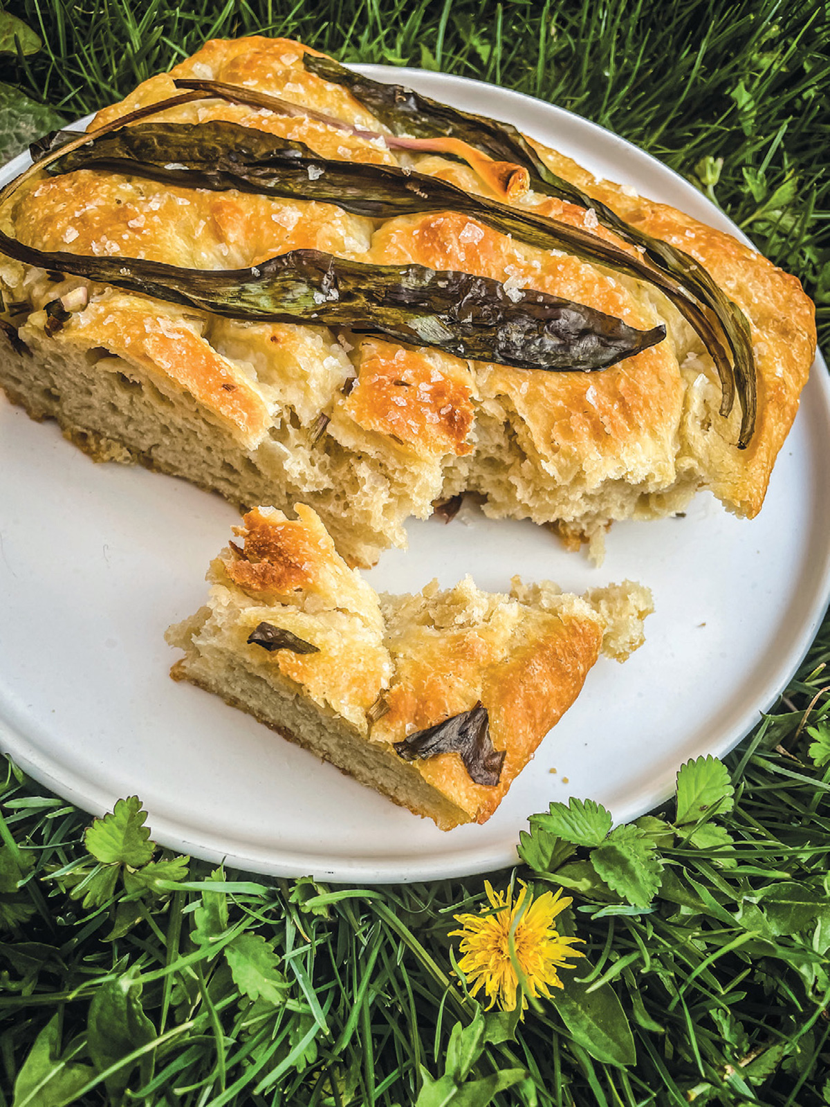 Heat the oven to 425°F and place a rack in the middle. Stir together 1 tablespoon olive oil and the chopped ramps and sprinkle evenly over the top of the dough.Place the whole leaves on top, if using. Pour 1 more tablespoon of olive oil all over the dough and ramps, coating your fingers with some of the oil. Using your coated fingers, press straight down to create dimples in the dough. Two or three presses is fine: you don’t want to deflate the dough too much! Sprinkle the top with flaky sea salt.
